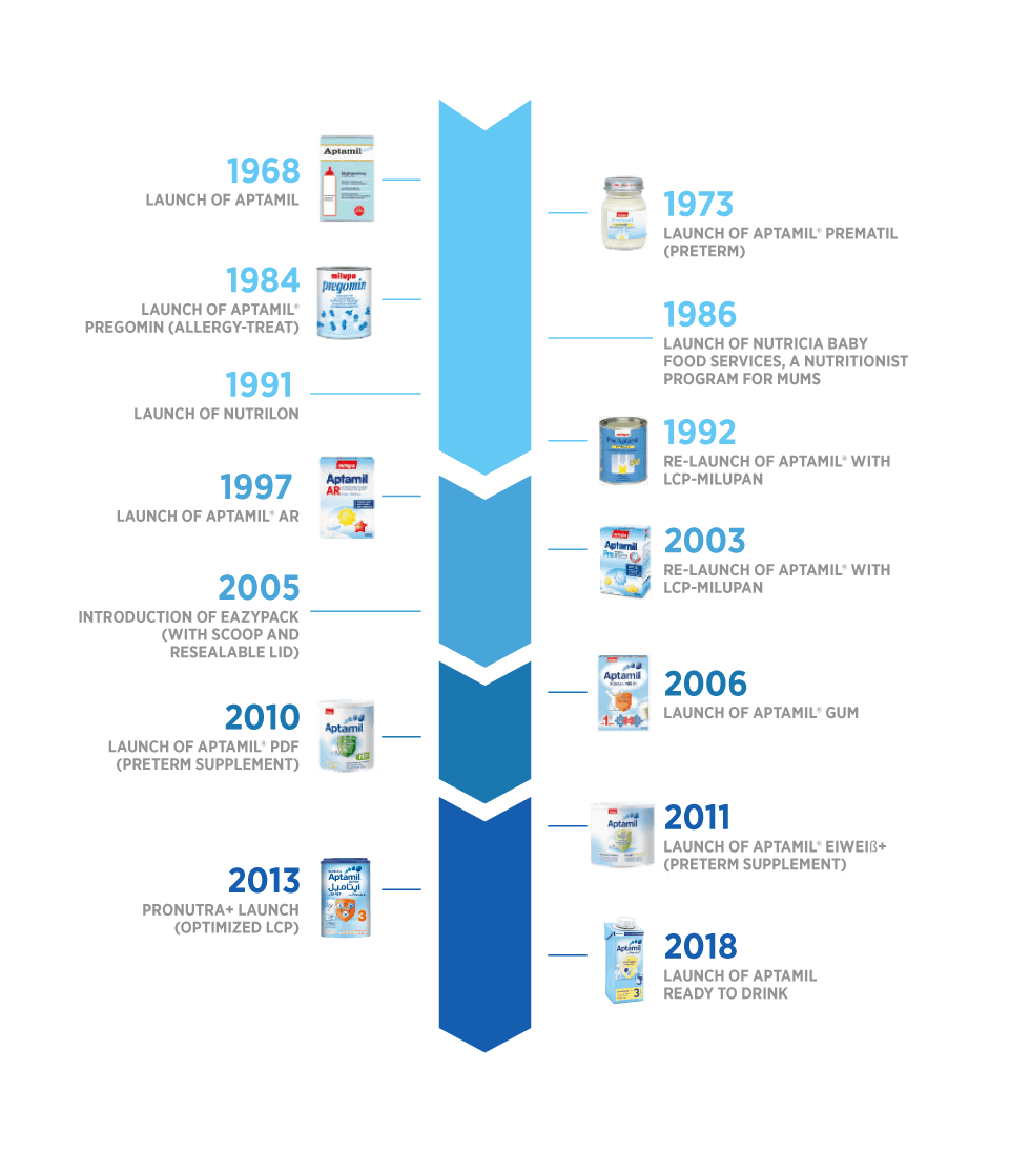 In 1945, Aptamil began a long-term research program with the mission of learning from the natural benefits of breast milk. This resulted in Aptamil as a brand launching its first infant milk formula in Europe. Today it is available in over 90 countries around the world.