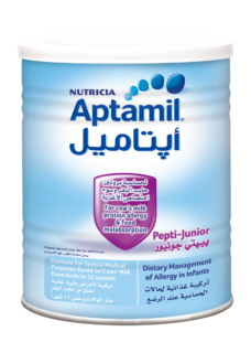 تركيبة حليب أبتاميل بيبتي جونيور مصممة للأطفال الذين يعانون من حساسية بروتين حليب البقر و سوء امتصاص الأغذية.
