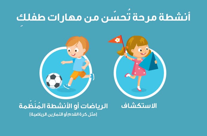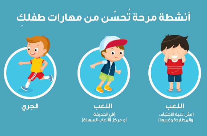 تنص ارشادات دائرة الصحة الوطنية المتعلّقة بممارسة الأنشطة، على أن يمارس الطفل الأنشطة يومياً لمدة 180 دقيقة على الأقل، ويجب ألا يتوقّف الطفل الأقل من عمر خمس سنوات عن الأنشطة لفترات طويلة خلال اليوم (باستثناء النوم). هذاـ ويُدرك معظم الآباء جيداً أن الأطفال دون سن الخامسة يحبون ممارسة الأنشطة، سواءً من خلال اللعب أو مجرد الركض (أو الحبو) واستكشاف البيئة المحيطة، مما يسهل من الالتزام بالمدة الضرورية للأنشطة. وتتوفر مئات الطرق التي تتيح للطفل ممارسة الأنشطة، بما في ذلك:
