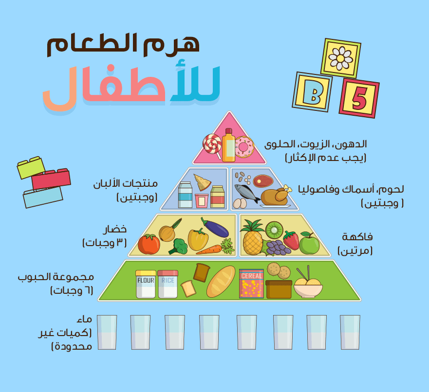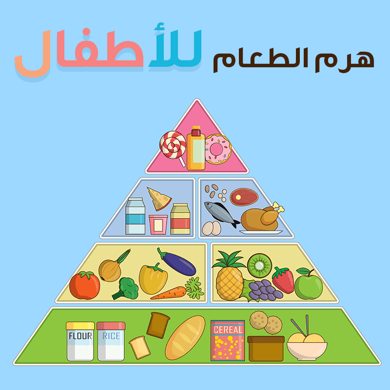 إن وجود طبق مليء بالألوان المختلفة، بالإضافة إلى تشكيلة متنوعة من الأطعمة ذات الخصائص الغذائية المُكمّلة، يضمن حصول طفلك على غذاء صحي ومشهّي. ولحصول طفلك على الكمية الصحيحة من كل صنف غذائي، احرصي على فهم الهرم الغذائي للأطفال والذي يتكوّن من خمس طبقات، مع وجوب إدخال عنصر واحد على الأقل من كل طبقة في كل وجبة للحصول على غذاء صحي للأطفال: