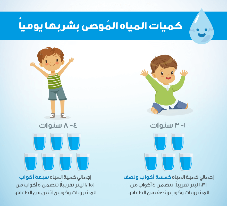 يعتمد مقدار الماء الذي يحتاج طفلكِ لشربه يومياً على عدد من العوامل بما في ذلك العمر، وفيما إذا أكان الطفل ذكراً أو أنثى، ومدى نشاطه وحرارة جسمه. في حين ينبغي أن يحصل الجسم على معظم الرطوبة من الماء، يمكن أن يحصل على بعضها من سوائل أخرى كالحليب والشوربة، والأطعمة الغنية بالماء مثل الفاكهة والخضروات.
