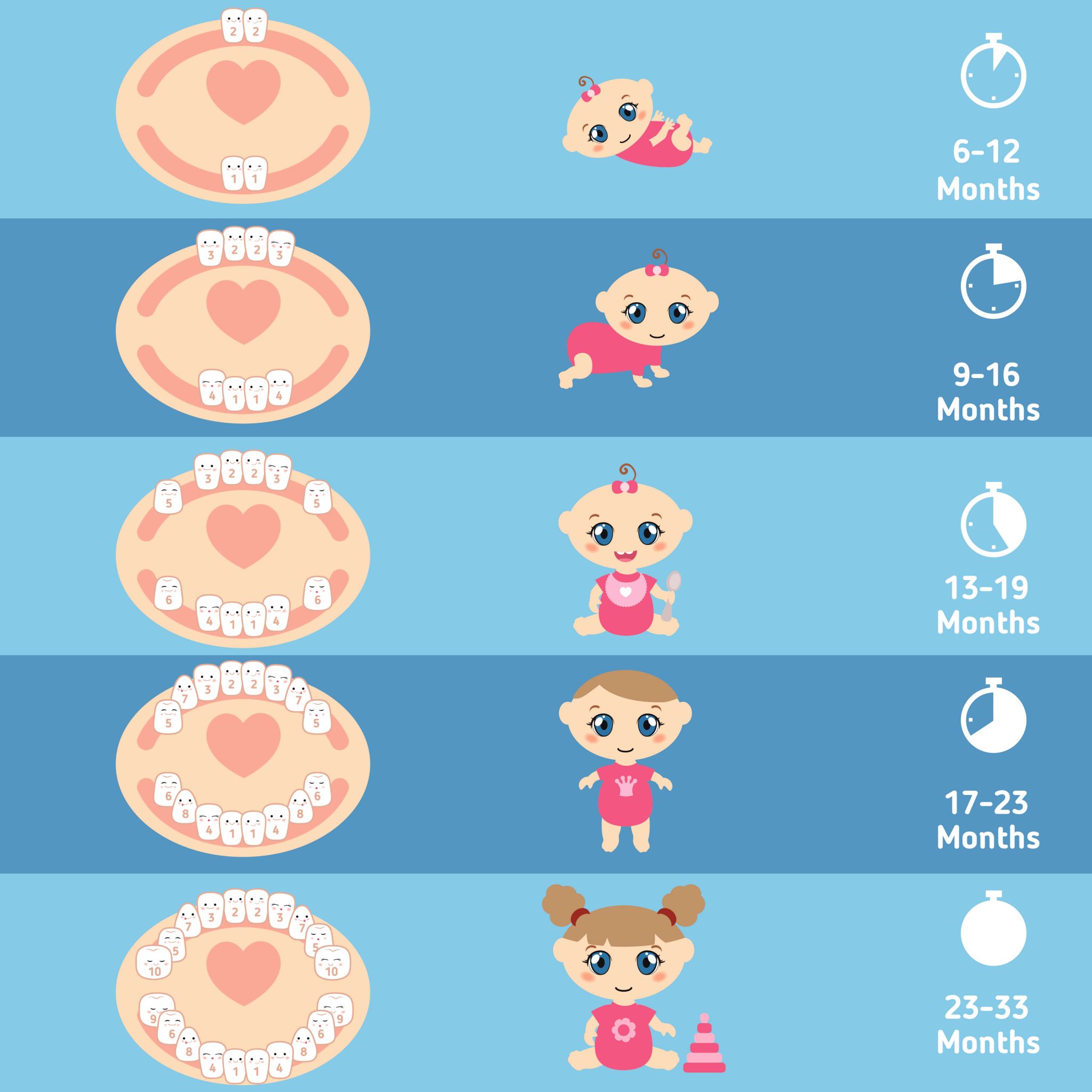The following list shows the most typical order of tooth eruption in babies and children, although you shouldn’t be concerned if your baby’s teeth come through in a different order. If a tooth seems to be showing no signs of coming through as expected, however, your baby’s dentist can advise.