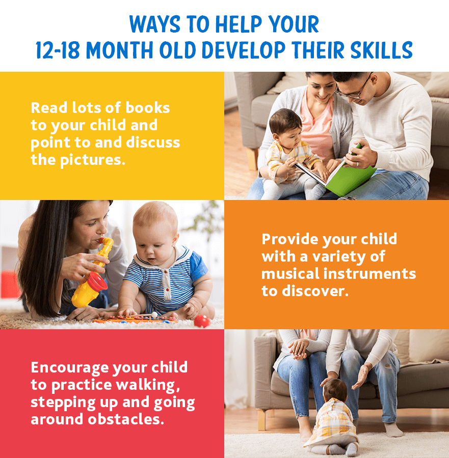 Here’s an idea of the skills that your 12-18 month old will be developing during their first year: