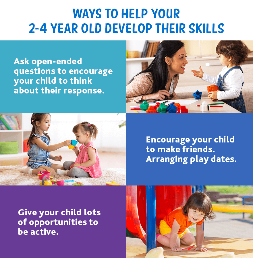“The key skills that your child will be developing between the ages of one and four years old fall into six categories – verbal, creative, cognitive, interactive, physical and fine motor skills”