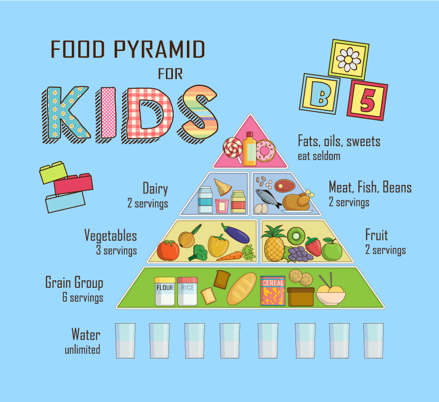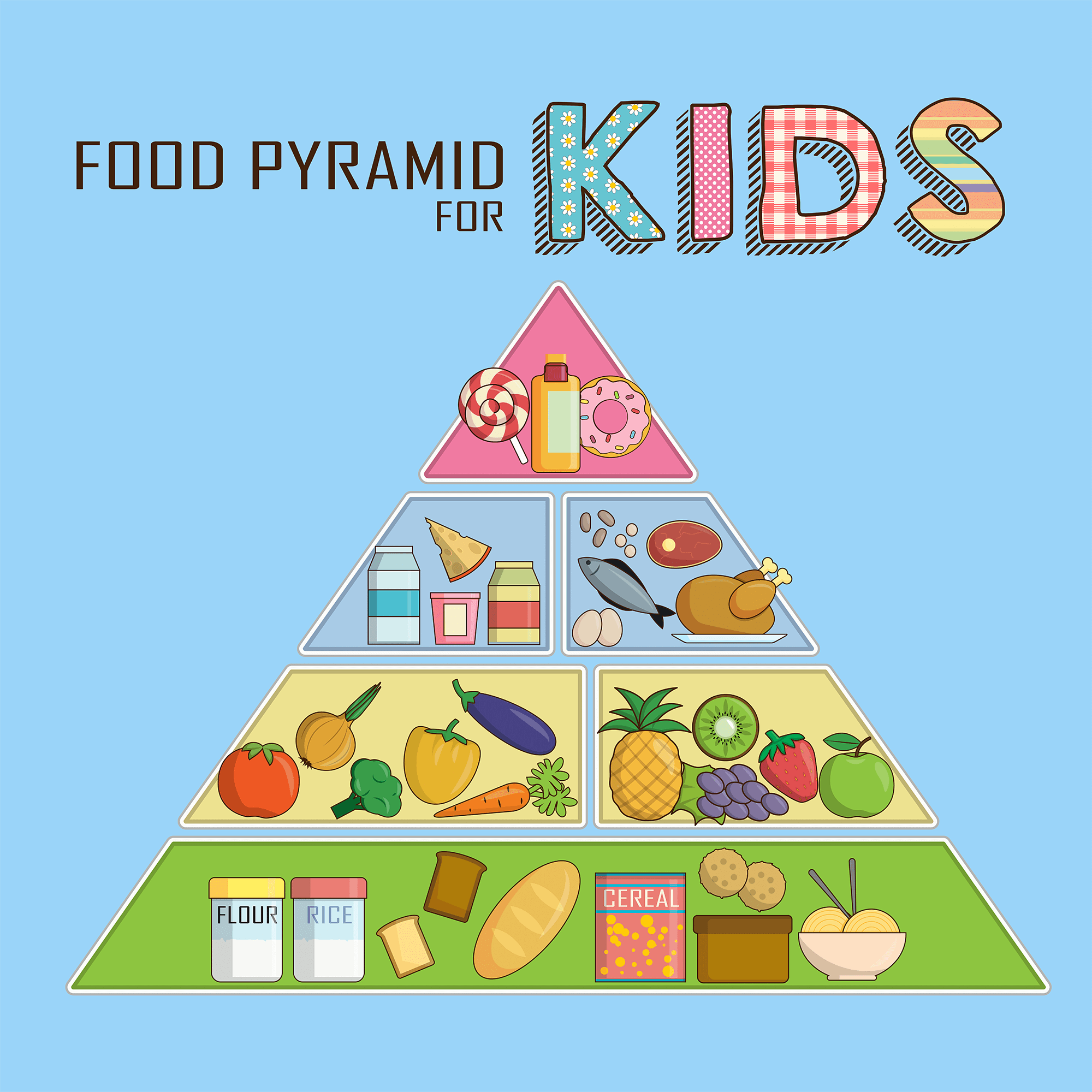 Having a plate full of different colours, combined with a variety of foods with complimentary nutritional properties will ensure that your child gets an appetizing and well-balanced diet. To make sure that your child gets the correct amount of each nutritional type, it’s important to understand the five-layer food pyramid for kids. At least one element from each layer should be included in each meal to maintain a balanced diet for kids: