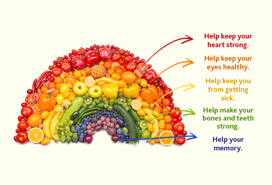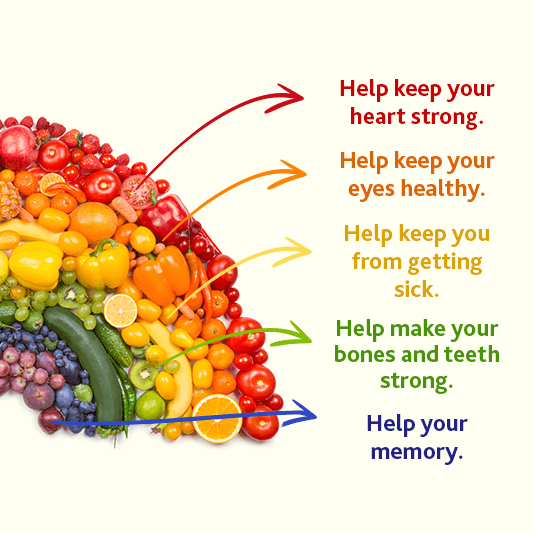 – The greens like broccoli, celery, kale, lettuce, spinach, sprouts, kiwi fruits, green apples etc. help make bones and teeth strong as well as boosting the immune system.
